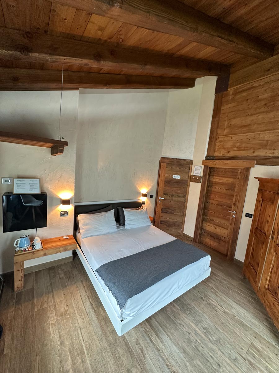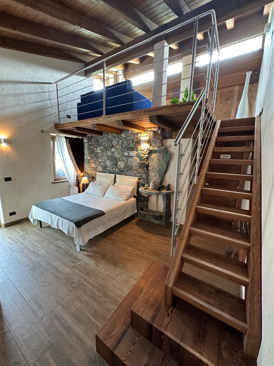 Parfaite pour passer un moment de détente, cette chambre douillette dispose d’un studio en mezzanine en bois et d’un mur en pierre pour recréer l’architecture alpine traditionnelle.
