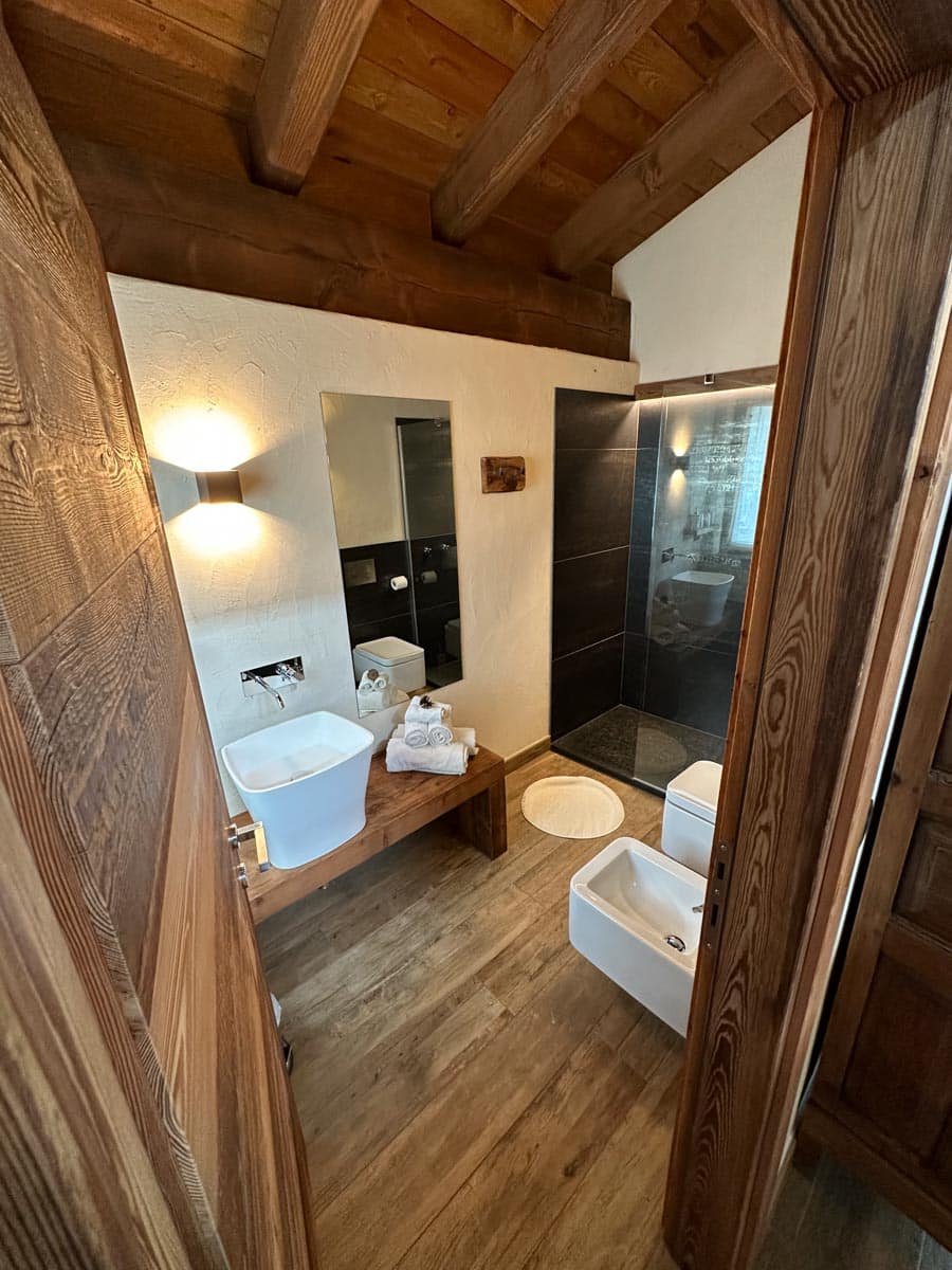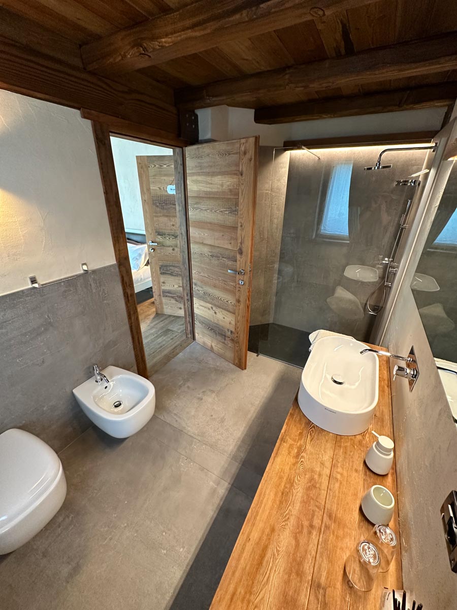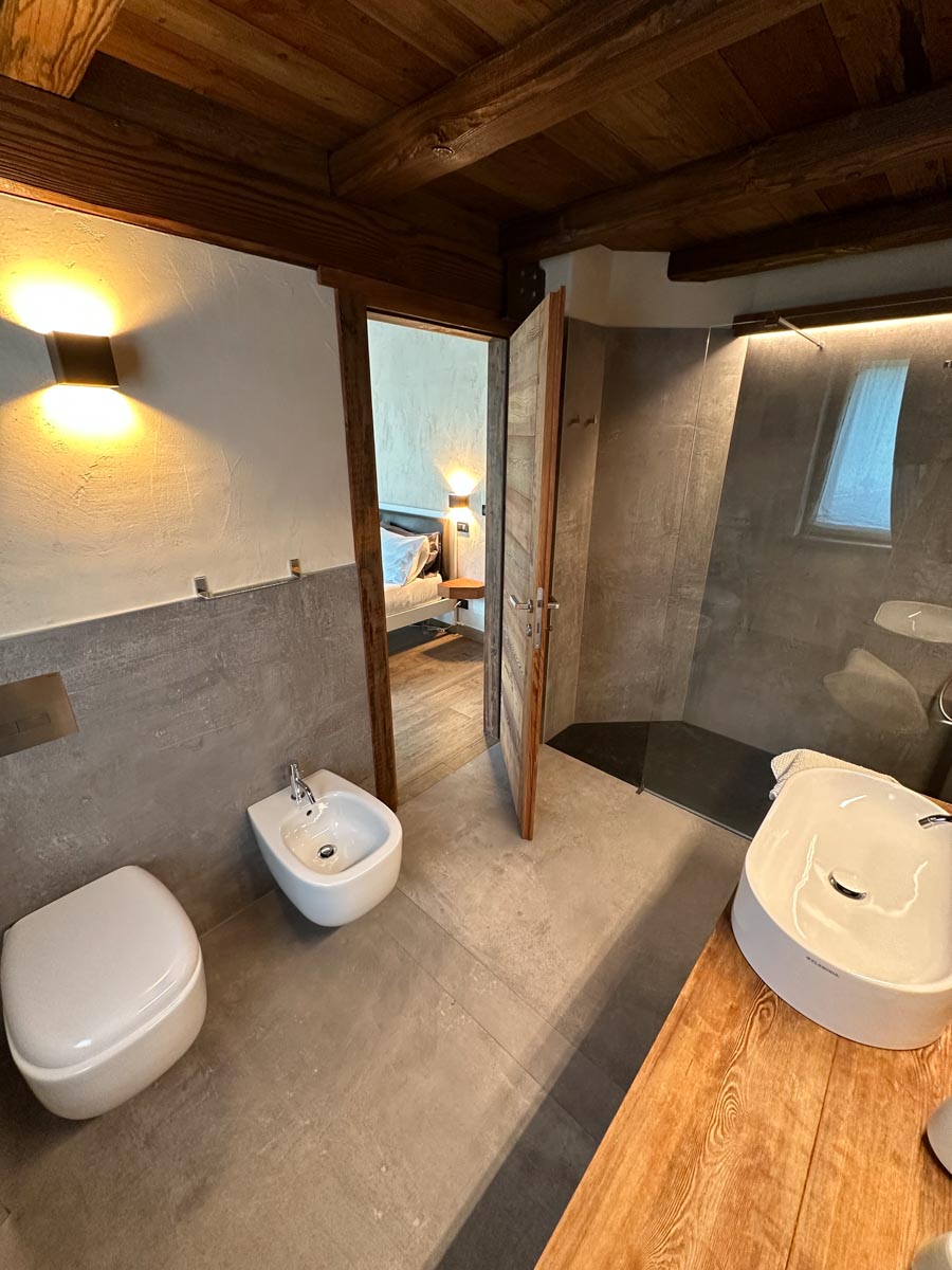 Il bagno è composto da un’ampia doccia vetrata e fornito di asciugamani e asciugacapelli. Dalla camera si può accedere ad una terrazza comune con una stupenda vista della vallata.