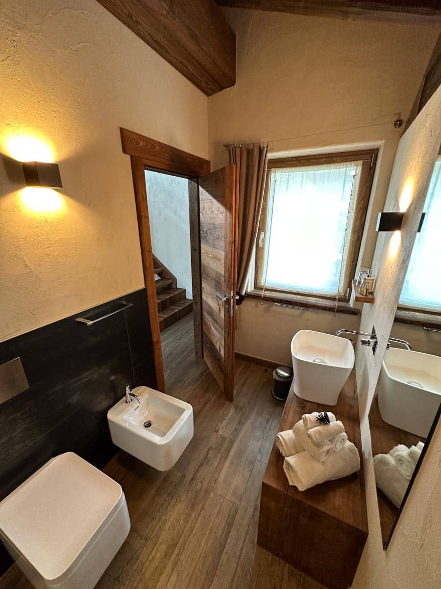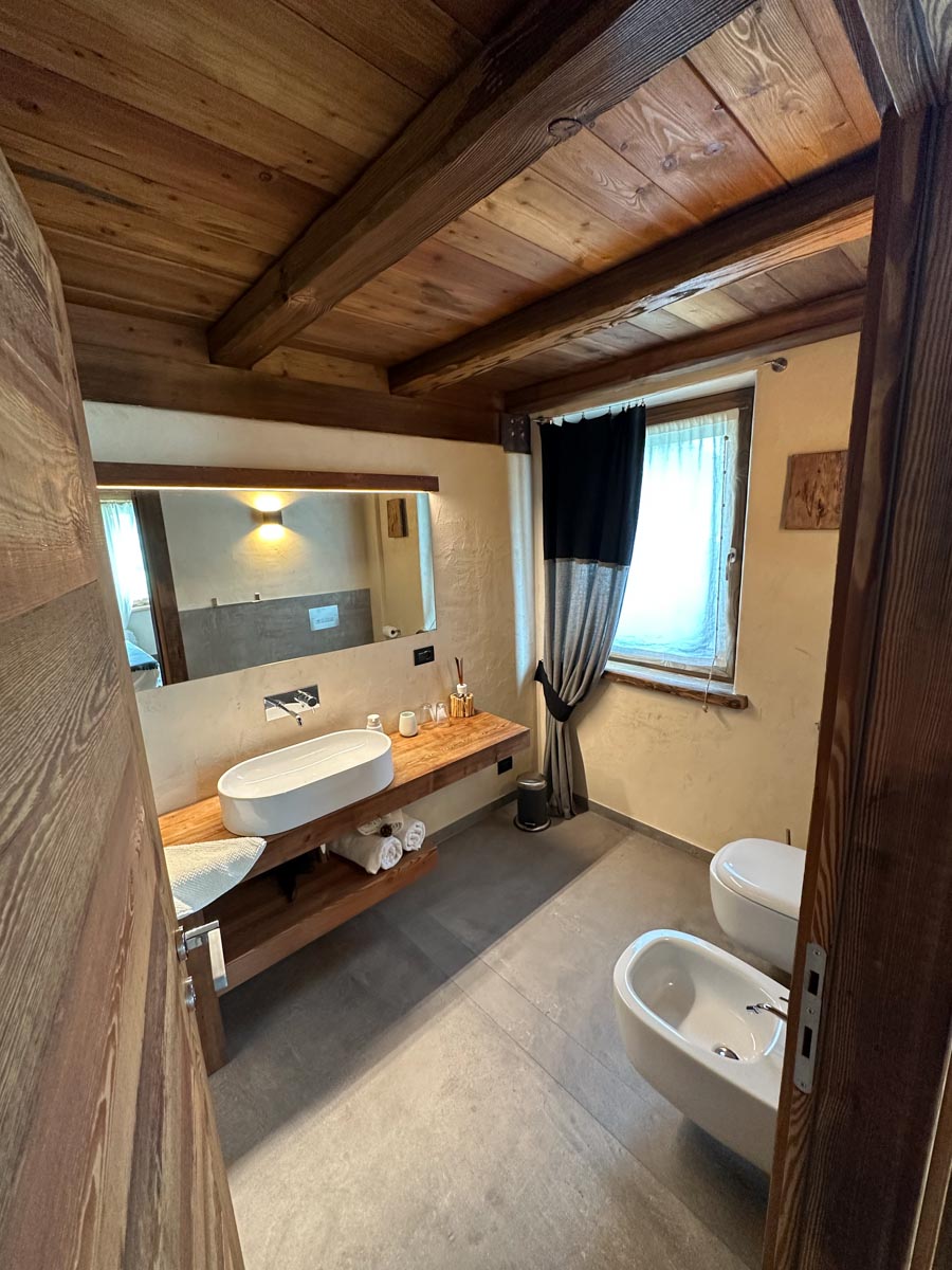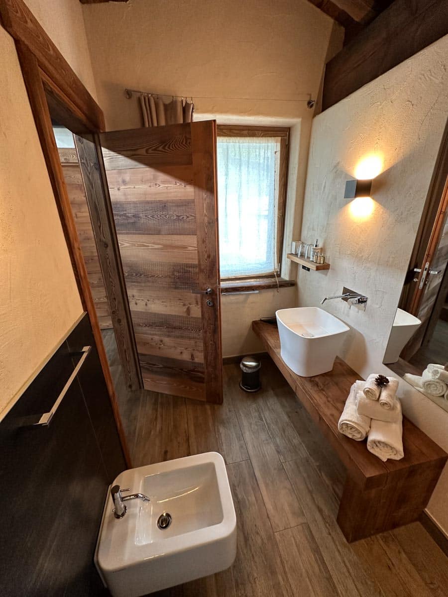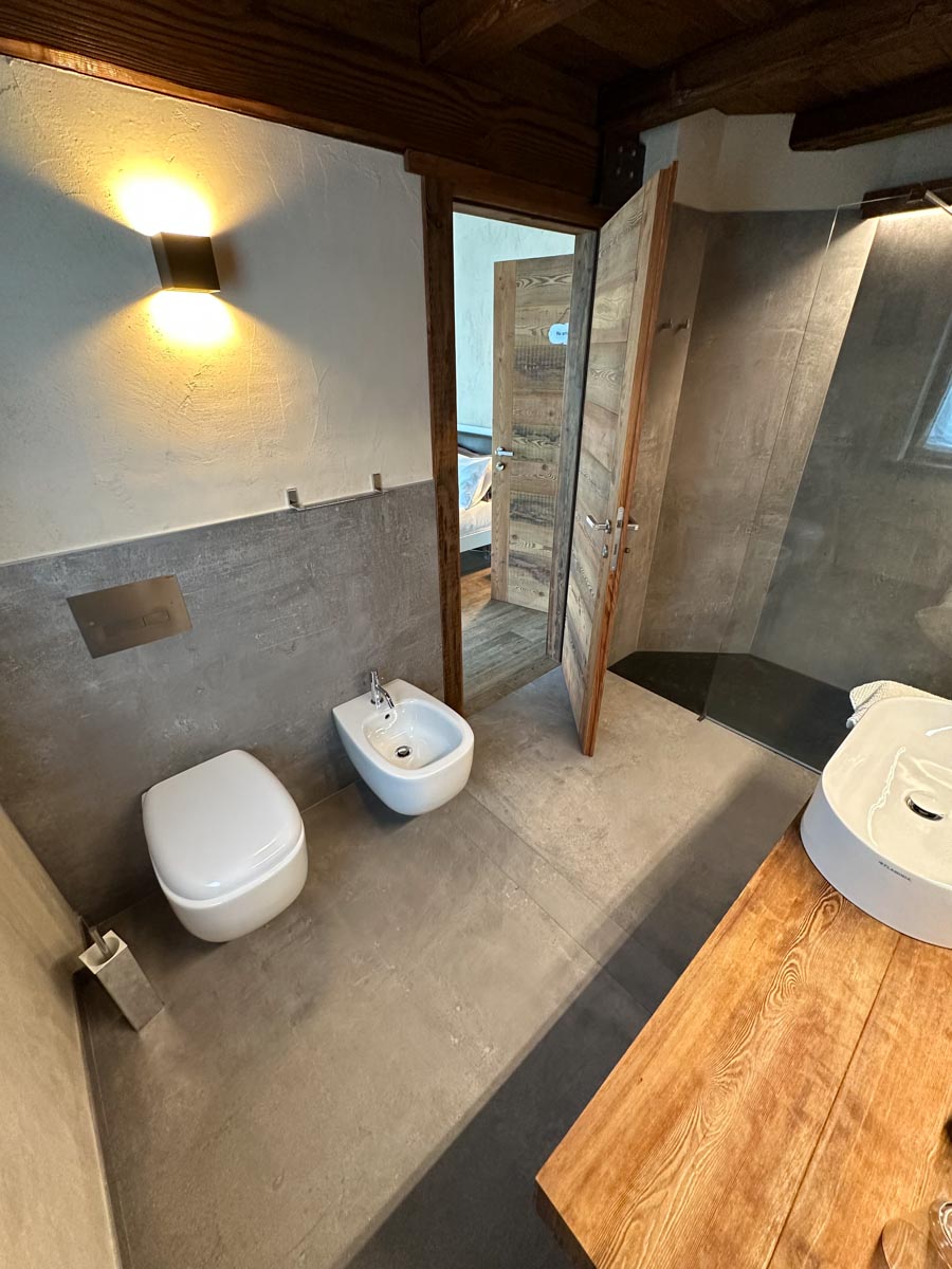 Il bagno è composto da un’ampia doccia vetrata e fornito di asciugamani e asciugacapelli. Dalla camera si può accedere ad una terrazza comune con una stupenda vista della vallata.
