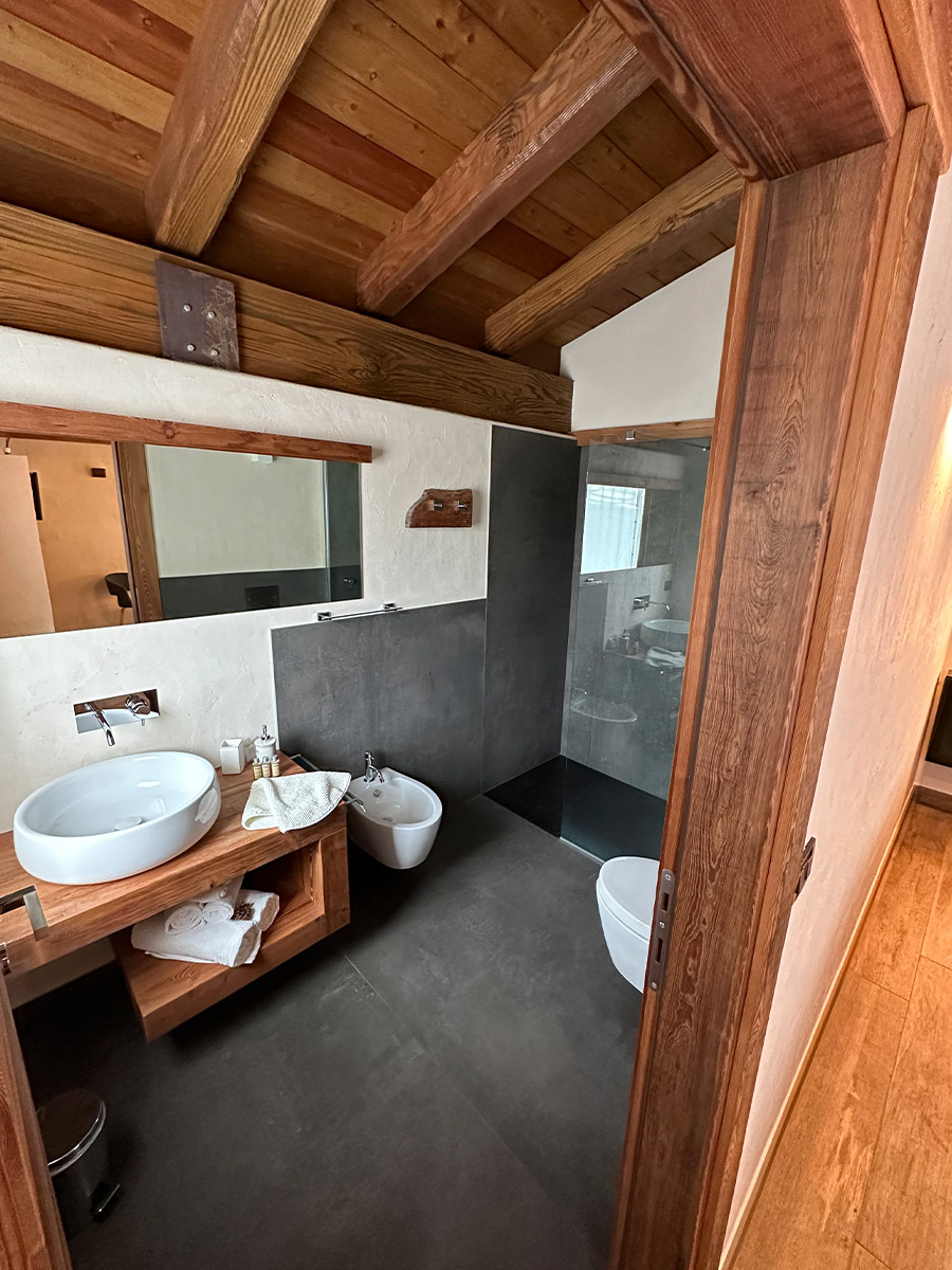 Il bagno è composto da un’ampia doccia vetrata e fornito di asciugamani e asciugacapelli. Dalla camera si può accedere ad una terrazza comune che da sulla verdeggiante vallata.